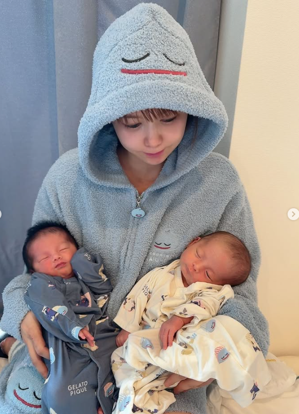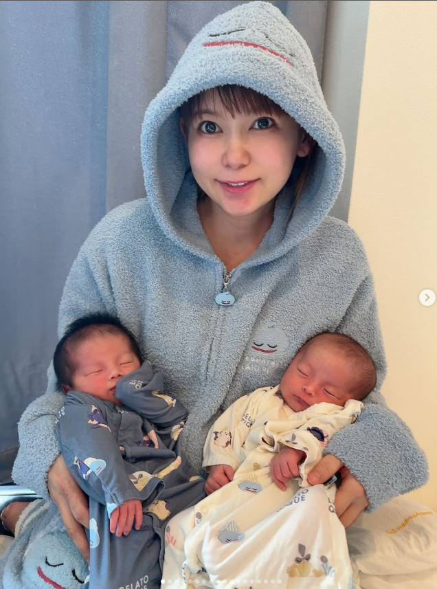 20日にインスタグラムで「朝からスライム双子ワンオペ!」と書き始めると、人気ゲーム「ドラゴンクエスト」シリーズに登場するモンスター・スライムのベビー服を着せた双子の写真をアップ。「起きてるけどなぜだかずっと2人ともおとなしく泣かずごきげんで助かってます ミルクは順番 うんちいっぱいしました たまに搾乳。抱っこも交互に。なんだか抱っこするとすごく顔を見つめるようになった感じ ママってわかるかなぁ?」とつづった。