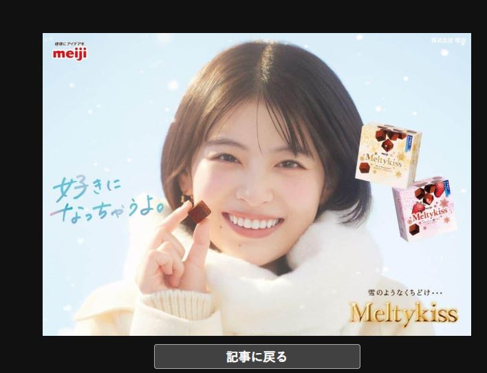 一方、明治は25年10月21日、「メルティーキッス」のイメージキャラとして俳優・出口夏希さん(24)を起用した新グラフィックおよび新CM「冬の待ち合わせ」篇を同日から放映すると発表した。お馴染みのテーマソングはそのまま、歌声が変わった。